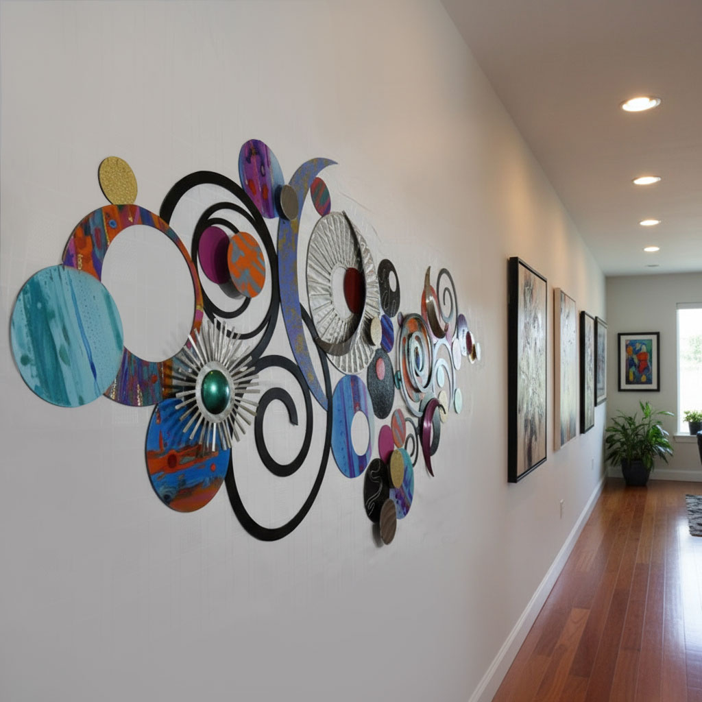 Add an artsy and modern edge to your decor with Chromatic Circles Cascade, a striking handmade metal wall art featuring vibrant circles, moons, and spirals in a minimalist, contemporary style.